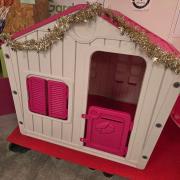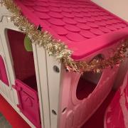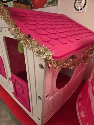 Maisonnette rose équipée de bac à fleur, boîte aux lettre et horloge fictive